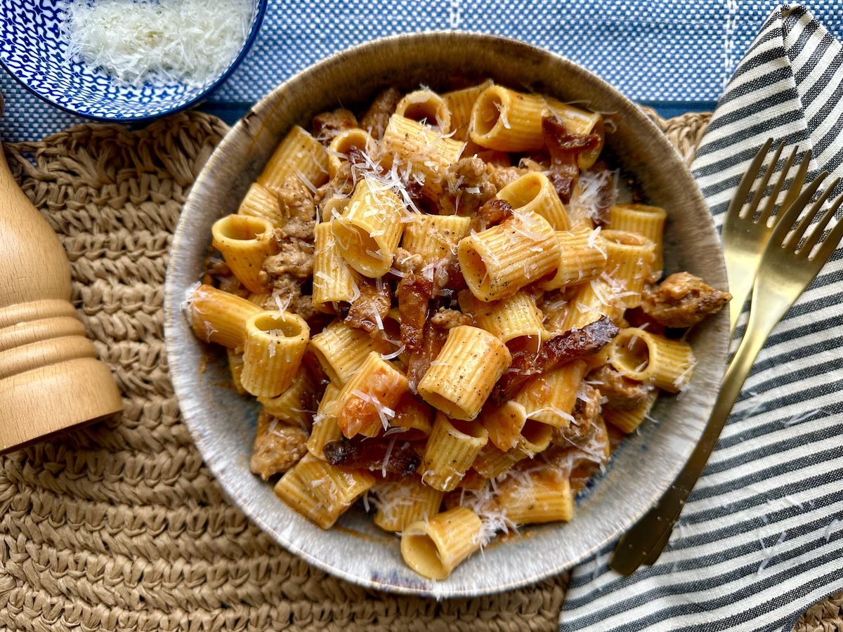 - Add pasta to the pan with sausage mixture, turn heat to medium-high and add half of the reserved pasta water, cooking until tomato paste forms a glossy sauce. Off the heat, stir in the yolk-cheese mixture, tossing quickly to coat. Add reserved pasta water as needed to create a silky sauce.