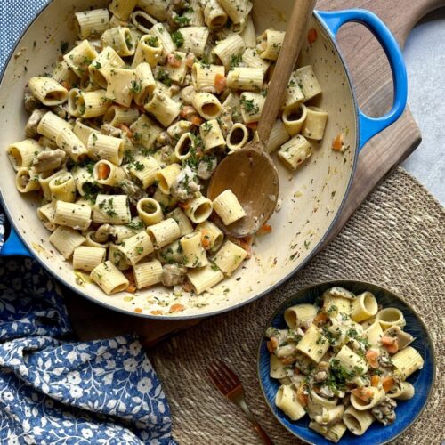 All the cozy comfort of a classic chicken pot pie—without the crust. This creamy pasta dish features tender chicken thighs, hearty vegetables, and Italpasta Artisan Mezzi Rigatoni, all wrapped in a rich, savoury sauce that’s perfect for chilly nights or easy weeknight dinners. It’s familiar, satisfying, and ready to impress with just one pan.