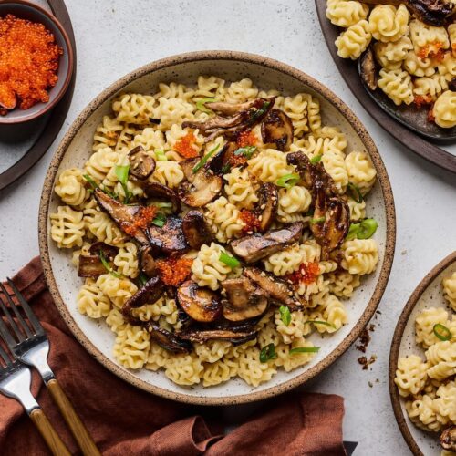 Miso Butter Radiatori with Crispy Mushrooms, Tobiko & Furikake